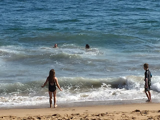 | Kaitlyn, Emma and James swimming out past the waves. |
